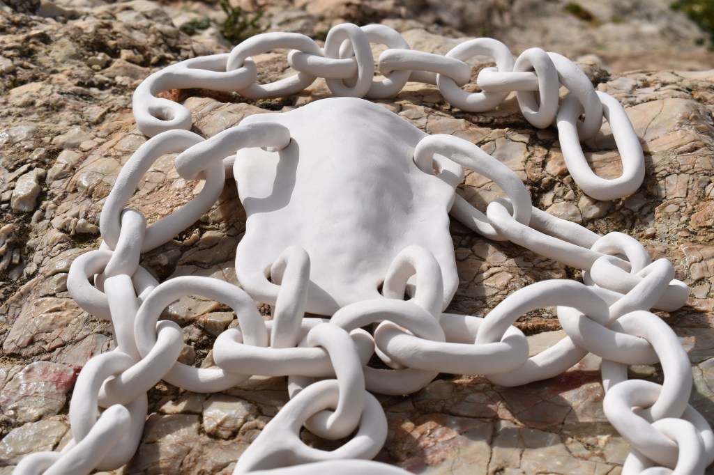 Dimentional collage, chain and parts. The empty spaces between the clay. When placed in uneven surfaces it adjusts.