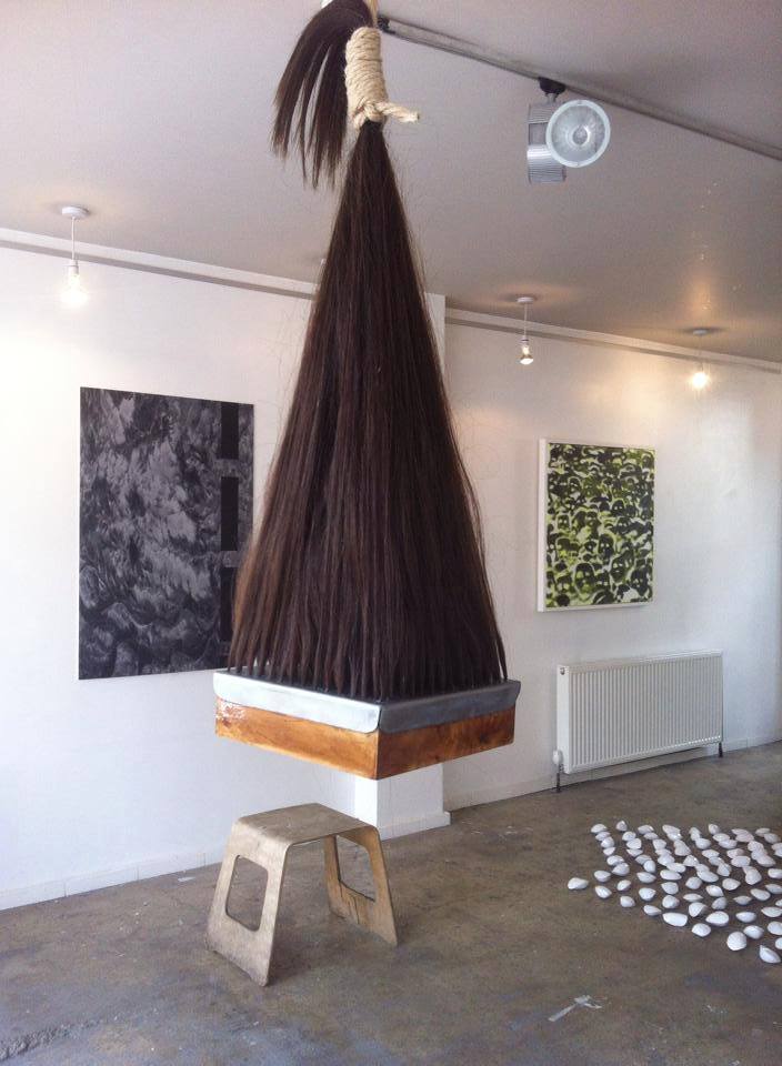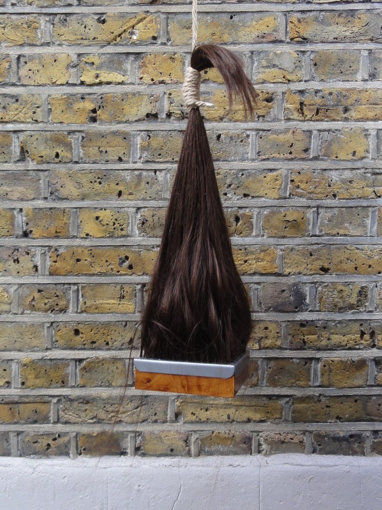 The sculpture is suspended from the ceiling with the block of wood being approximately at eye level. The tension of the hair holding the wood and metal is balanced.
